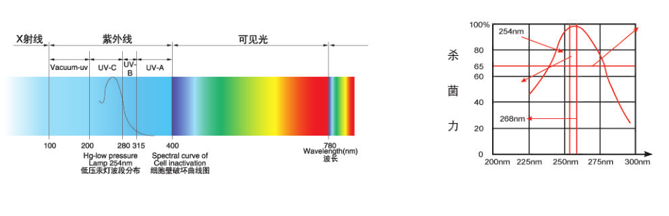 紫外線是介于可視光線和X射線之間的電磁波頻譜。200nm至400nm的紫外光譜有很強(qiáng)的殺菌效力, 其峰值在265nm。 在這個(gè)波長(zhǎng)范圍內(nèi)的紫外線主要是通過(guò)刺穿細(xì)胞膜,破壞細(xì)胞內(nèi)脫氧核糖核酸和破壞細(xì)胞內(nèi)的其它分子,使微生物不能再?gòu)?fù)制和繁殖,而最終達(dá)到消毒作用。 紫外線殺菌器實(shí)物拍攝依照波長(zhǎng)范圍,可將紫外線分為4個(gè)波段:
